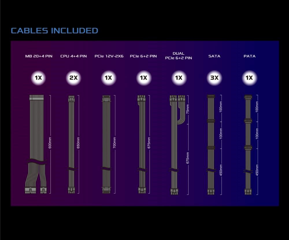 8pin CPU 1x, SATA 15-pin, PCIe 8-pin, Molex