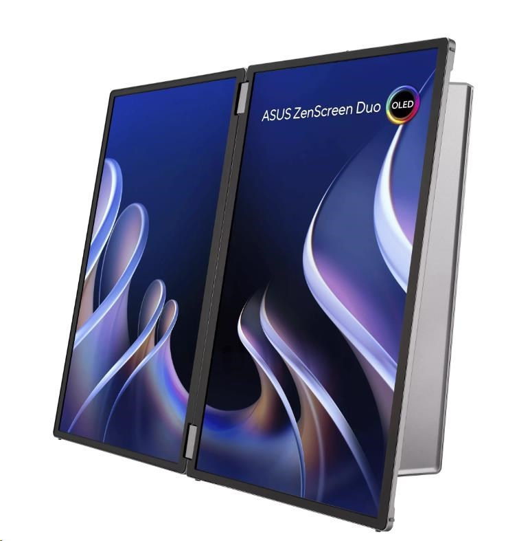 Dva 14palcové panely OLED s rozlišením 1920 × 1200 FHD, poměrem stran 16:10, technologií DisplayHDR™ 400 True Black, 100% DCI-P3, Delta<2, dvěma USB typu C®, mini-HDMI®, stojanem a standardním otvorem pro stativ.