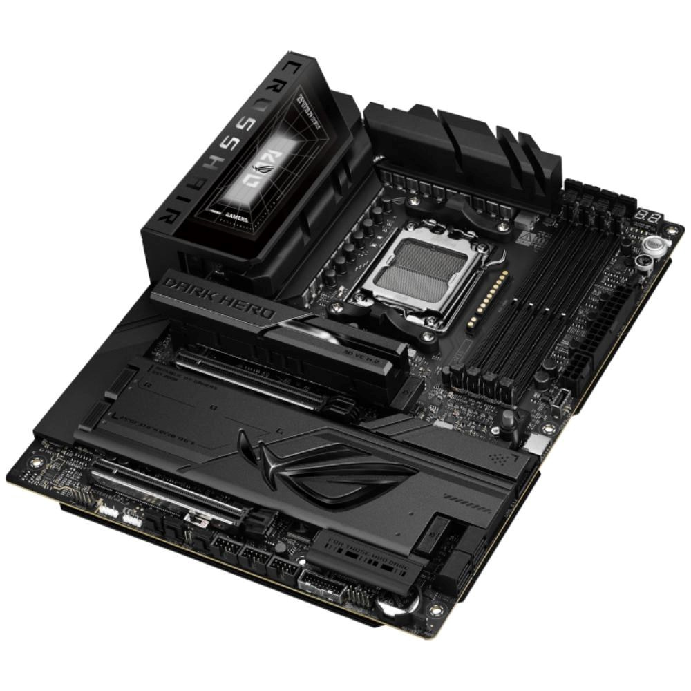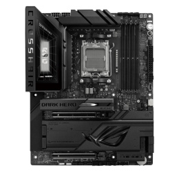 ROG Crosshair X870E Dark Hero delivers refined performance for high-end builds, featuring a robust 20+2+2 power stage design, support for high-speed DDR5 memory, and the latest PCIe® 5.0 connectivity. It offers five onboard M.2 SSD slots with heatsinks, including a 3D VC M.2 heatsink for advanced thermal performance, along with Realtek 10G Ethernet and USB4® ports for next-generation connectivity. ASUS-exclusive AI technologies and Polymo Lighting II complete the platform, balancing intelligent tuning with a clean, premium aesthetic.
