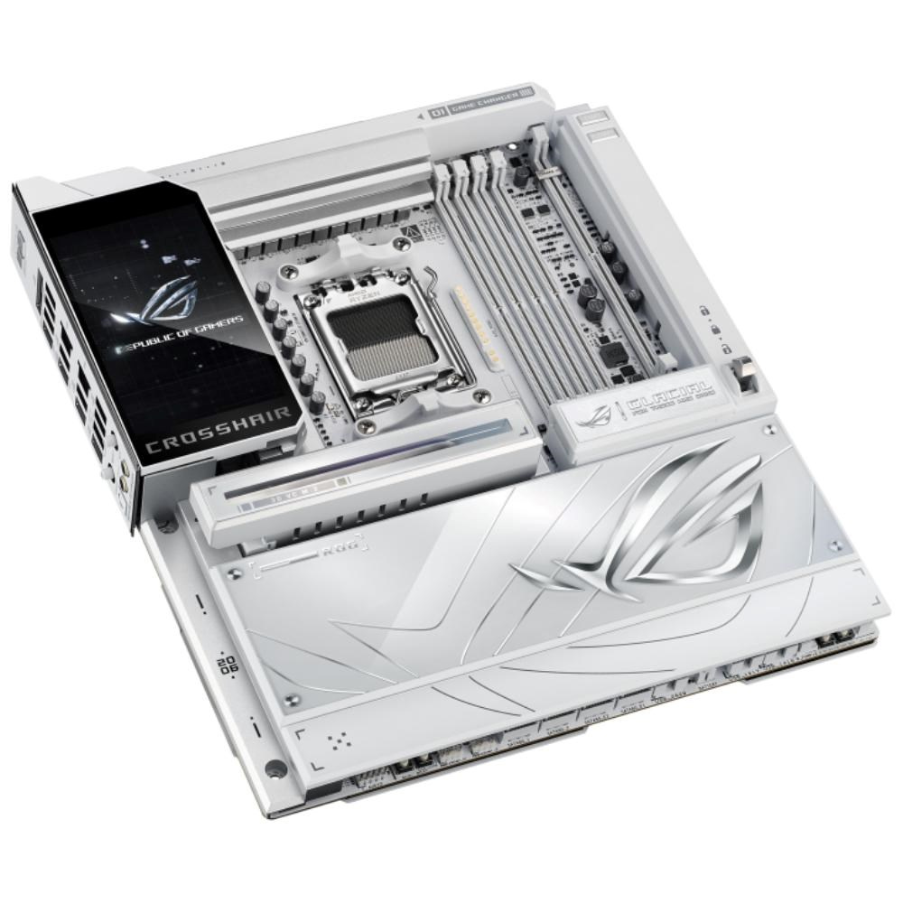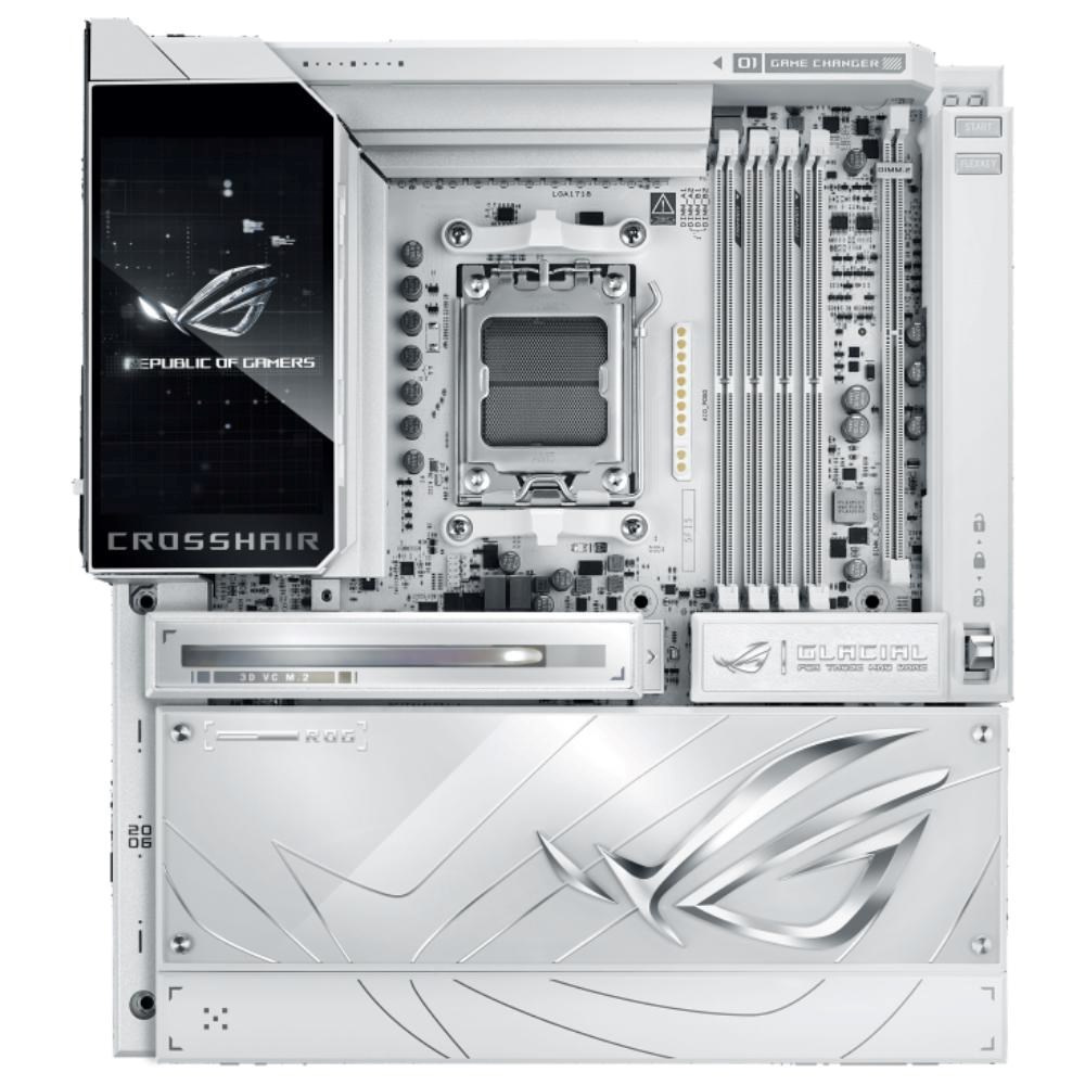The ROG X870E Glacial is a flagship motherboard engineered for uncompromising performance and sophisticated AI. It boasts a robust 24+2+2 power stage design, Dynamic OC Switcher, and Core Flex for next-generation overclocking control. Meanwhile, advanced memory tuning is unlocked through server-grade DRAM enhancement and NitroPath DRAM technology, and storage scales with support for up to seven M.2 drives. Top-tier connectivity includes two 10G Ethernet ports, two USB4® ports, and two USB 20Gbps Type-C® front-panel connectors. This motherboard also features a 3D VC M.2 heatsink and a 5-inch LCD display, along with AI Cache Boost and AI Advisor for smarter, more intuitive system tuning.