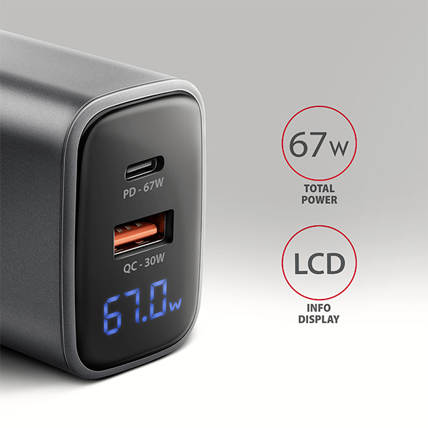 Cestovní nabíječka do sítě AXAGON ACU-PQ67D GaN umožňuje rychlé nabíjení až dvou mobilních zařízení současně. Díky celkovému výkonu 67W dokáže nabíječka dobíjet notebooky, tablety, telefony a další mobilní zařízení nejvyšší možnou rychlostí. Adaptér nabízí nejen standardní USB-A konektor, ale také oboustranný USB-C konektor. Přehledný LCD displej zobrazuje aktuální výkon nabíjení.