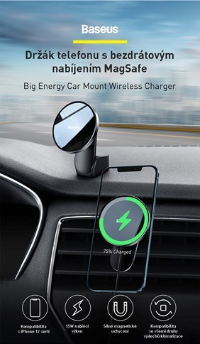 Kvalitní a elegantní magnetický držák mobilního telefonu s?bezdrátovým nabíjením, který je kompatibilní s?řadou iPhone 12 vybavených MagSafe. Samozřejmostí je retail balení.