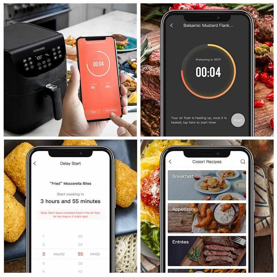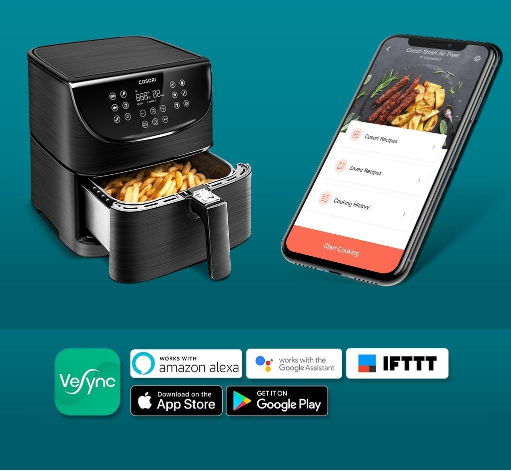 S horkovzdušnou fritézou COSORI CS158-AF PREMIUM SMART si můžete užít vaše oblíbená smažená jídla bez výčitek, protože na rozdíl od běžného smažení nebo fritování je v této horkovzdušné fritéze možné připravovat jídla za použití velice malého množství oleje nebo vůbec žádného. Kombinace cirkulujícího horkého vzduchu, dokonalé teploty vaření a chytrých programů zajistí, že hranolky budou vždy krásně křupavé a kuřecí stehna šťavnatá. Programy si rychle a pohodlně můžete nastavit také přes Smartphone nebo Amazon Alexa a Google Assistant. Až budete mít hotovo, čištění bude stejně snadné díky nepřilnavému koši, který lze mýt v myčce. Díky veliké nádobě s objemem 5,5l navíc dokážete rychle navařit i pro větší rodinu nebo skupinu hostů.