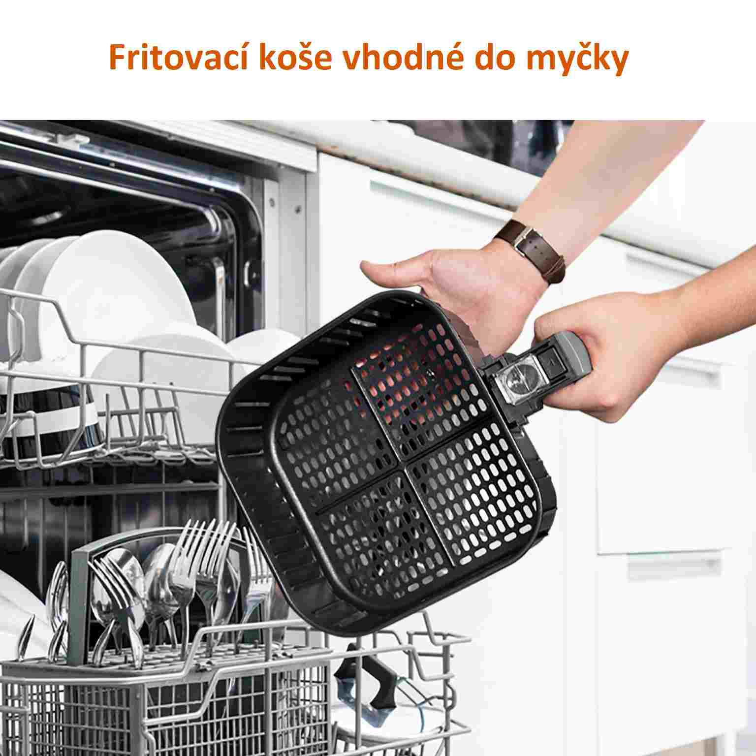 Vyjímatelný fritovací koš a nádoba jsou vyrobeny z odolného, nepřilnavého a zdravotně nezávadného materiálu (BPA a BFOA FREE) a lze je mýt v myčce. Vždy chladná rukojeť a tlačítko pro uvolnění koše eliminují riziko popálení a nechtěného uvolnění.
