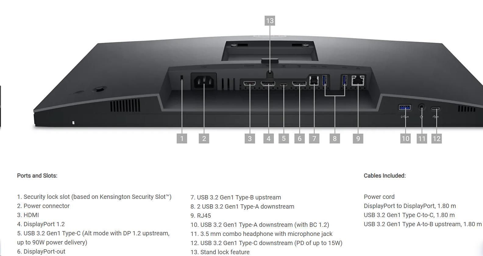 | Cables Included | 1x Power cable 1x DP-to-DP cable (1.8m) 1x USB 3.2 Gen1 Type C-to-C cable (1.8m) 1x USB 3.2 Gen1 Type A-to-B upstream cable (1.8m) |
