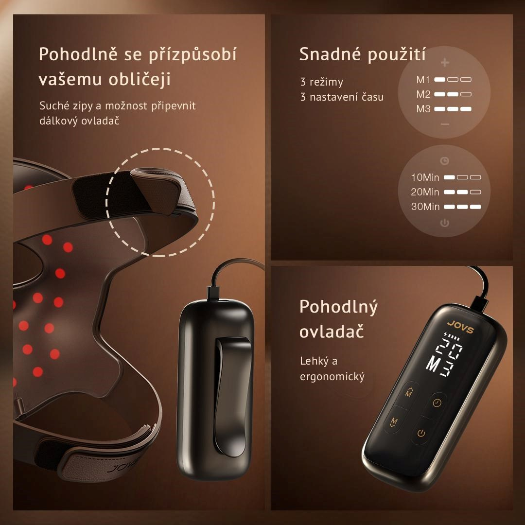 Revoluční 4D laserová technologie – čtyři vlnové délky pro komplexní omlazení pleti 4D v2 Laserová maska Jovs představuje průlom v oblasti domácí laserové terapie díky unikátní kombinaci čtyř dlouhovlnných světel – 660 nm, 850 nm, 940 nm a 1064 nm. Každá z těchto vlnových délek působí v jiné hloubce pokožky a cílí na specifické problémy – od mdlé pleti a tmavých kruhů, přes ztrátu pevnosti až po hluboké vrásky. Klíčová inovace spočívá v použití profesionální vlnové délky 1064 nm, která byla dosud dostupná pouze v klinických laserových přístrojích. Tato technologie proniká hlouběji do dermis, aktivuje produkci kolagenu a podporuje přirozenou regeneraci pleti. Ve srovnání s běžnými LED maskami dosahuje až šestinásobné účinnosti, přináší rychlejší a viditelnější výsledky a umožňuje dosáhnout profesionální úrovně ošetření přímo v pohodlí domova.