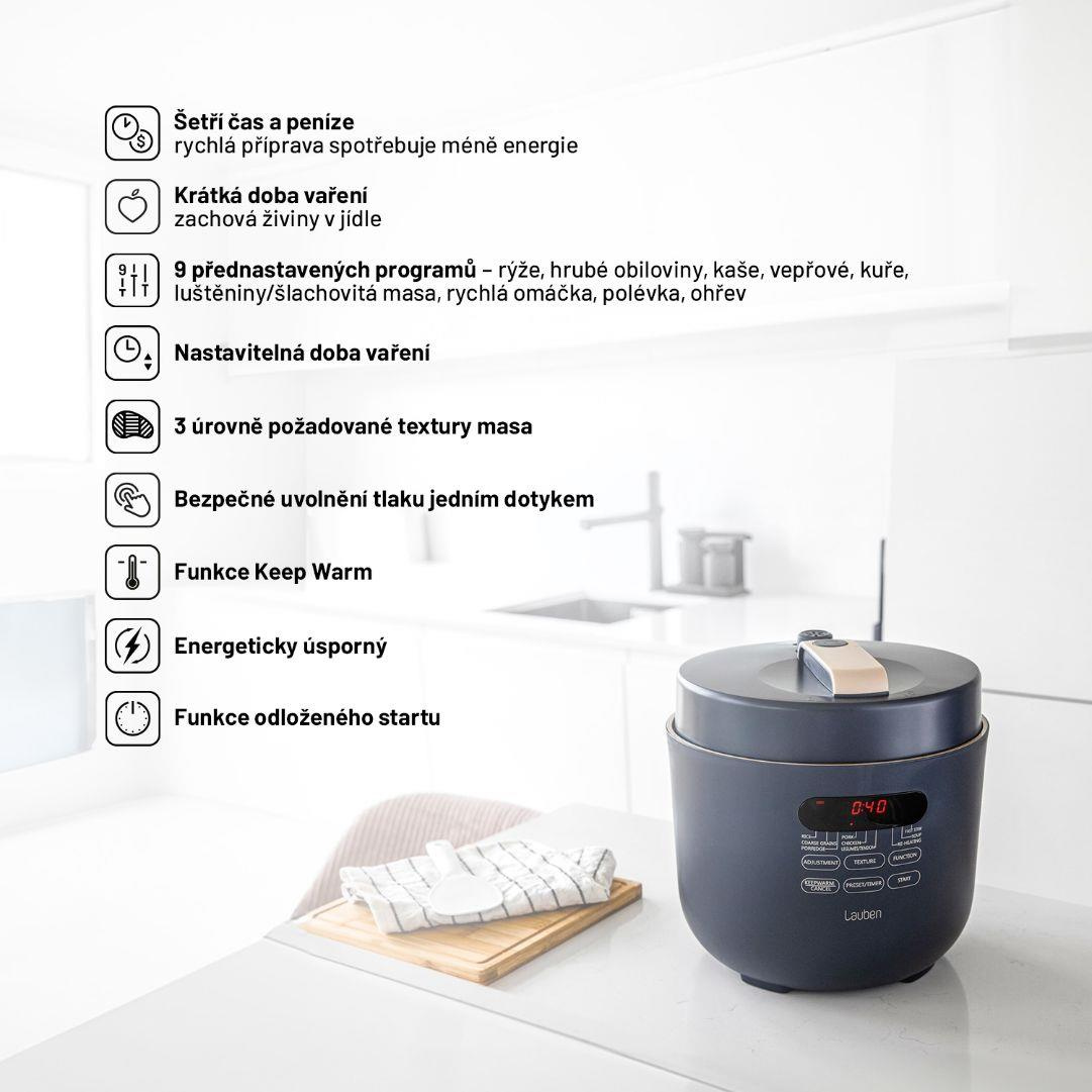 Víceúčelový a energeticky úsporný elektrický tlakový hrnec Lauben Electric Pressure Cooker 5000AT umí díky tlaku uvnitř připravit chutné pokrmy za rekordně krátkou dobu. Čas, který ušetříte, tak můžete věnovat sobě či rodině. Zároveň uspoříte i peníze, neboť spotřeba energie je při tomto způsobu vaření nižší. Kratší příprava prospívá také surovinám, které si uchovávají více živin. Stačí přitom jediné, vložit vše potřebné do hrnce, zavřít, zapnout a o vše ostatní se již přístroj postará sám.