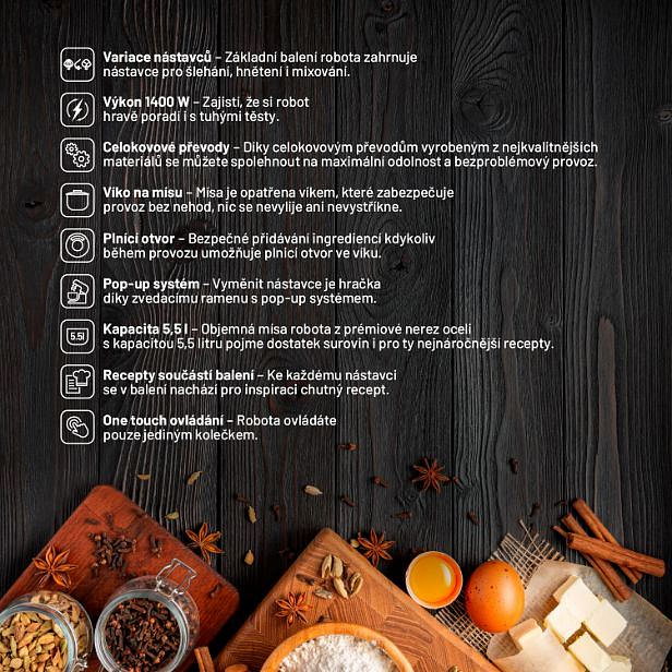 Oblé tvary kuchyňského robota se stanou ozdobou každé kuchyně, ve které nezabere příliš místa. Tento užitečný kompaktní pomocník disponuje několika nástavci, a to pro šlehání, hnětení i mixování. Připravíte tak snadno nejrůznější pokrmy a jako inspirace pro začátek vám poslouží přiložené recepty, ke každému nástavci jeden.