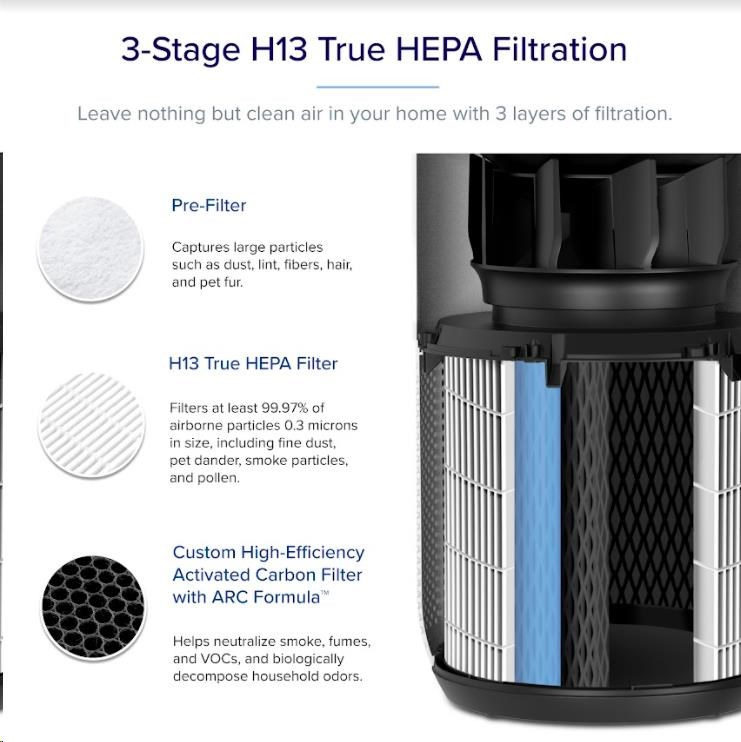Druhou vrstvou je HEPA filtr H13. To odlišuje Levoit od konkurence, protože filtr HEPA H13 je mnohem kvalitnější a spolehlivější než běžně používané HEPA H11. Zde se odfiltrují jemné prachové částice, plíseň, bakterie, pyl, kouřové částice, roztoče a srst.