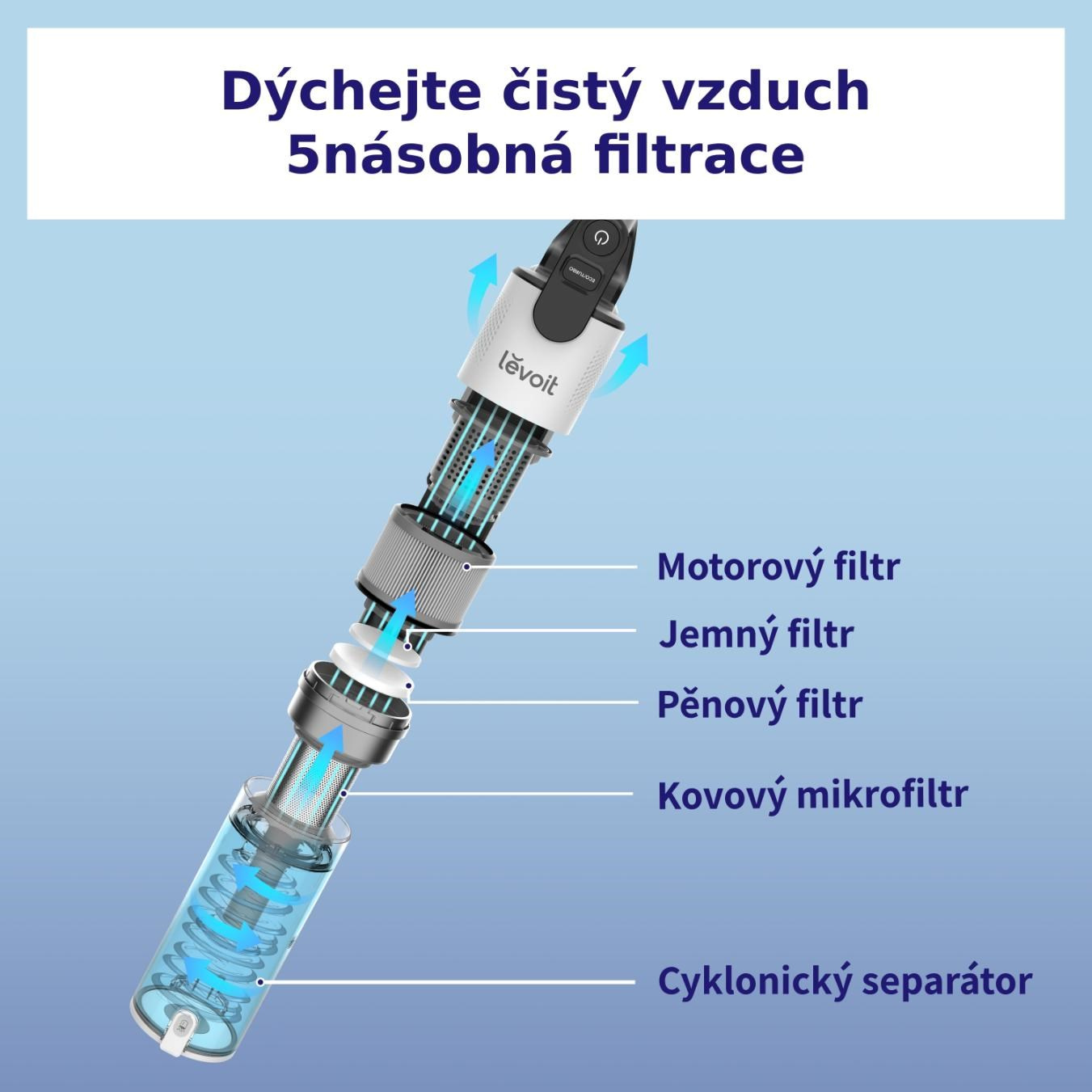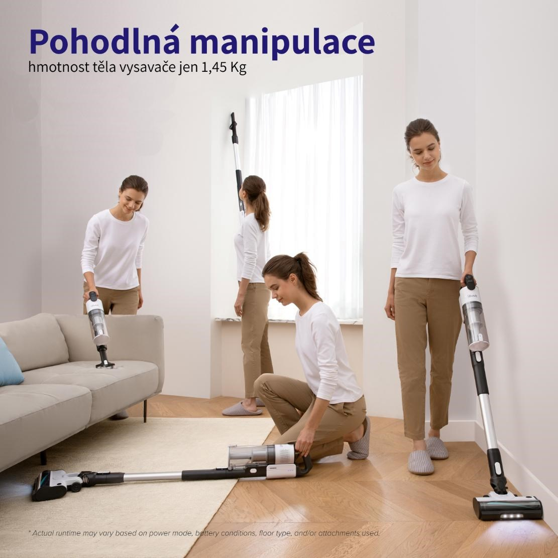 Vysavač Levoit je díky pečlivě vybraným materiálům a komponentům velmi lehký. Manipulace s ním je pohodlná i jednou rukou což oceníte při vysávání pavučin ze stropu nebo při vysávání prachu ze žaluzií.