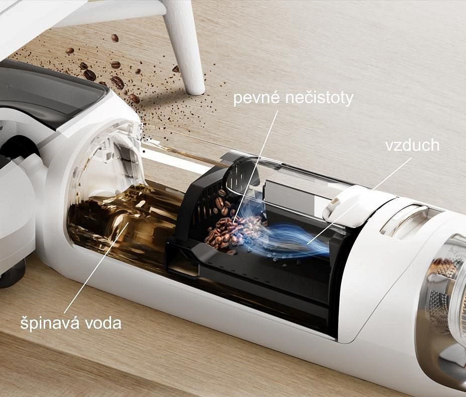 Unikátní tříkomorový systém spolehlivě odděluje pevné látky, kapaliny a vzduch, čímž chrání motor a zajišťuje plný čisticí výkon i při práci ve vodorovné poloze.