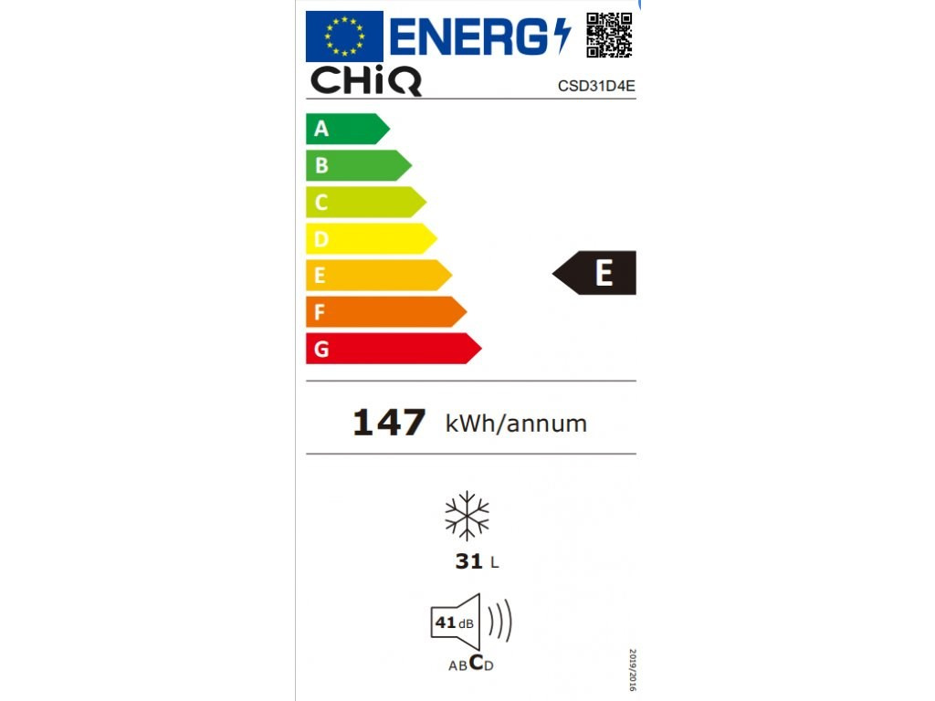 Popis CHiQ CSD31D4E minibar, 31 litrů, 2 přihrádky, -24 °C až +10 °C, mrazák - lednice, 41 dB - rozbaleno, testováno