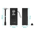 Kompresor disponuje velkým LED displejem, který zobrazuje stav nabití baterie, výběr přednastaveného režimu, výši tlaku a aktuální hodnotu tlaku. K dispozici je pět přednastavených režimů s výchozím rozsahem tlaku vzduchu pro jednotlivé použití (auto/motorka/kolo/míč/manuál). V manuálním režimu si můžete zvolit hodnotu, kterou si kompresor bude pamatovat pro příští použití. Díky vestavěné Li-Ion baterii s kapacitou 6 000 mAh, budete mít jistotu bezproblémového použití kdykoliv a kdekoliv. V případě nouze můžete kompresor využít i jako powerbanku a díky LED světlu si můžete posvítit při zhoršených světelných podmínkách. Kompresor je vyroben z kombinace polykarbonátu a ABS, který je extrémně pevný a tvrdý, odolný vůči vysokým teplotám (115 °C) a nárazu.
