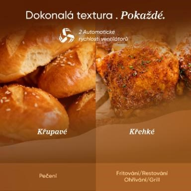 Uvnitř pracují dva výkonné DC motory, které zajišťují rychlejší ohřev a efektivnější proudění vzduchu. To znamená kratší dobu přípravy při zachování nižší spotřeby energie. Jídlo je hotové rychleji, ale bez kompromisů v chuti či textuře. Skutečné win-win řešení.