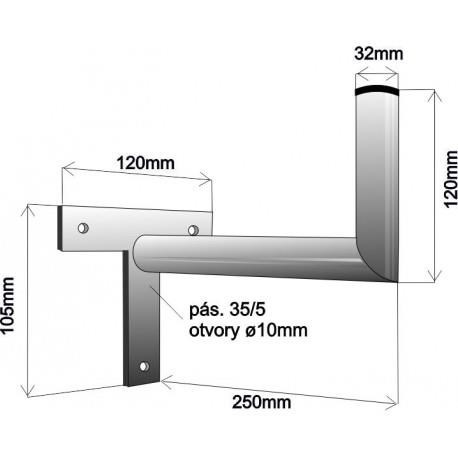 Držák antény na zeď u okna s pásem, levé uchycení, galvanický zinek, délka 25cm, průměr 3,2cm