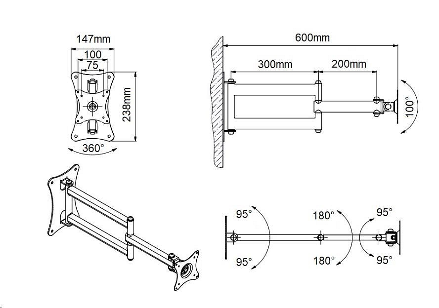 Kompletní specifikace Držák Tv nebo monitoru EDBAK GD26 Profesionální držák na televizi nebo monitor 15-43", otočný, sklopný, délkově nastavitelný, funkce pivot, VESA 75x75 a 100x100, nosnost 15kg Nástěnný držák vynikající kvality a robustní konstrukce pro zavěšení televize nebo monitoru 15-43". Držák podporuje VESA standardy 75x75 a 100x100, je možné zakoupit VESA rozšíření na 200x100 a 200x200. Po zavěšení Tv na držák můžete obrazovku otáčet na obě strany i kolmo ke zdi, naklápět nahoru a dolů, přetočit ji na šířku nebo na výšku. Vzdálenost od zdi lze nastavit v rozmezí 90-600mm. Držáky GD26 můžete zakoupit ve třech barevných variantách: černý, stříbrný nebo bílý. Nosnost držáku je 15kg. Záruka 5 let. Polohovatelný otočný sklopný a délkově nastavitelný držák na LCD LED televizory a monitory - EDBAK GD26 / drzakyastolky.cz Technické údaje: nosnost 15kg podporuje VESA standardy 75x75 a 100x100 možnost rozšíření VESA standardu na 200x100 nebo 200x200 za příplatek doporučená úhlopříčka televizoru nebo monitoru 15-43" nastavitelná vzdálenost od zdi minimální vzdálenost 90mm maximální vzdálenost 600mm funkce PIVOT - možnost otáčení obrazovky kolem osy otáčení do stran +/- 90° náklon +10° až -50° (lze i obráceně, dle montáže držáku) snadná a rychlá montáž profesionální kvalita ocelová konstrukce barva - černá, stříbrná nebo bílá záruka 5 let. , ,