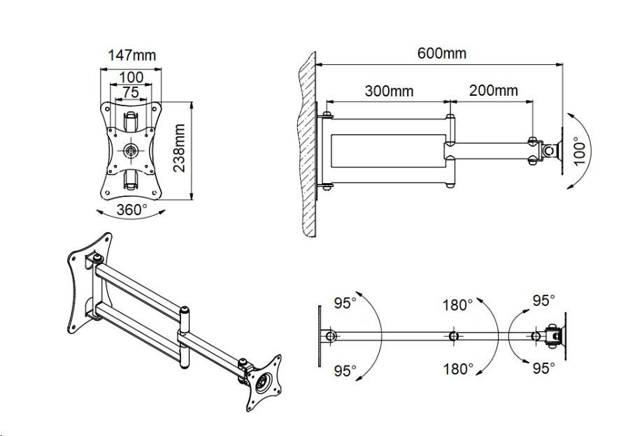 Profesionální držák na Tv monitory 15-43", VESA standard 75x75 a 100x100, otočný +/-90°, sklopný +10°/-50°, nastavení vzdálenosti od zdi 9-60cm, rotace pivot, profesionální držák, nosnost 15kg.Více