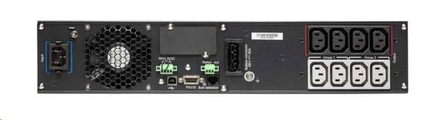 | Obsah balení | UPS (2) Výstupní IEC-IEC kabely USB kabel Sériový kabel (2) držáky pro montáž do 19' rozváděče (2) Sada pro montáž do datového rozvaděče (2) Podpěry pro samostatně stojící montáž Systém pro uchycení kabelu Bezpečnostní pokyny Stručná příručka |