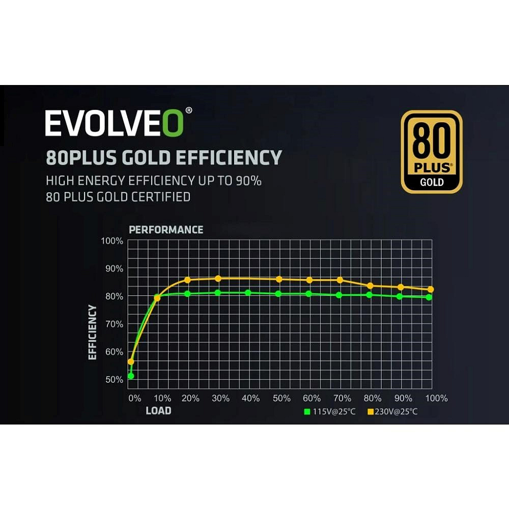 PC zdroj EVOLVEO G1000 je hrdým držitelem certifikace 80 PLUS Gold, která slibuje až 92% účinnost (při běžném 50% zatížení). Minimální ztráty energie a nízké zahřívání jdou přitom ruku v ruce s tichým chodem 140mm HDB ventilátoru – ten má mezi hřídelí a ložisky speciální olejovou vrstvu a jeho tření je nepatrné, takže hlučnost zůstává na minimu. S tímto zdrojem vás zkrátka hučení ventilátoru neruší – slyšet je jen svištění kol vaší formule nebo řinčení zbraní vaší armády.