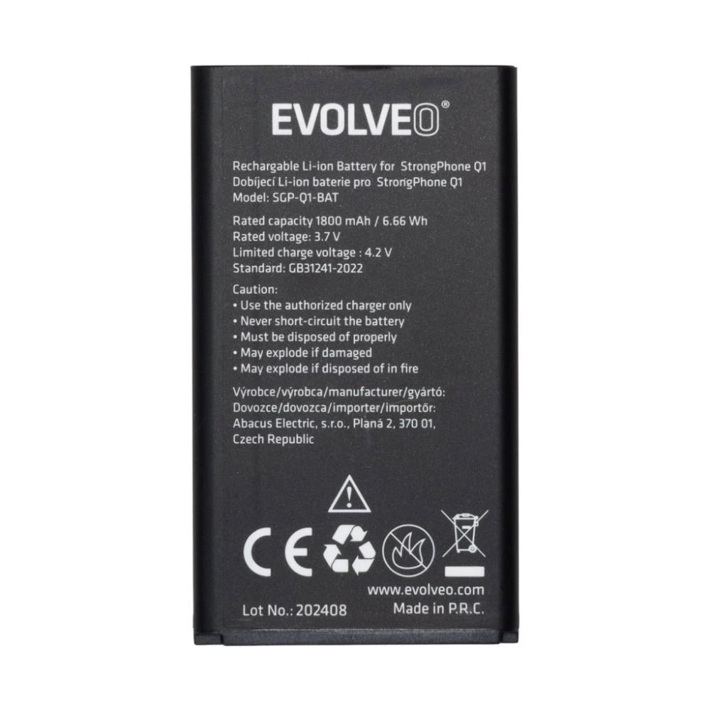 Originální baterie EVOLVEOUrčena pro mobilní telefon EVOLVEO StrongPhone Q1Kapacita 1800 mAhTyp baterie: Li-IonObsah balení:Baterie