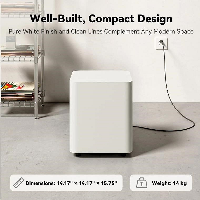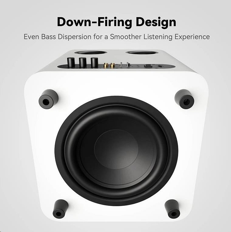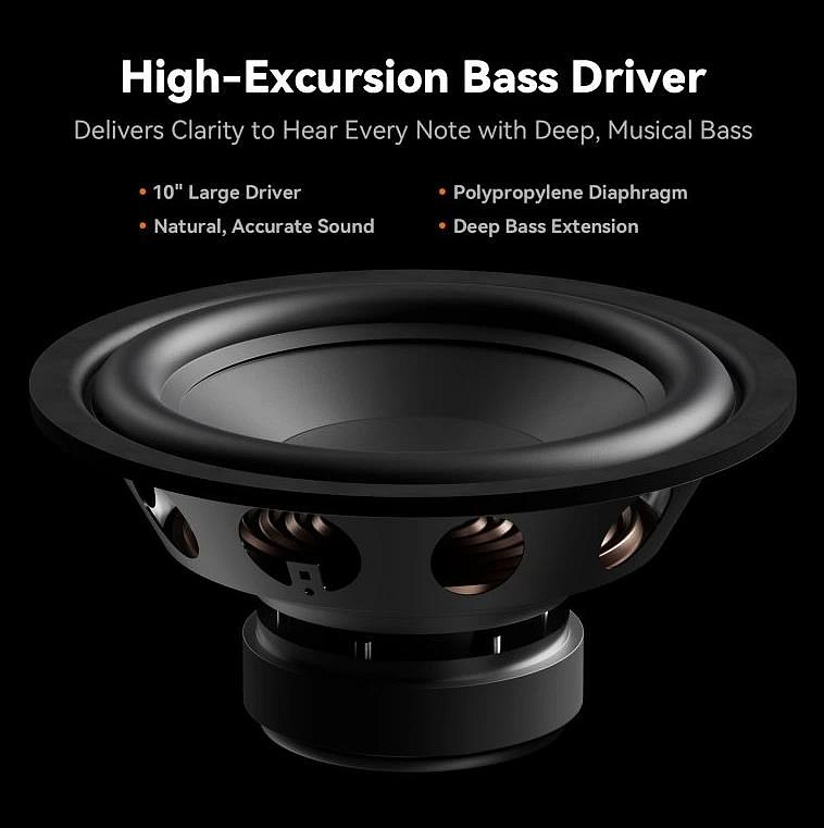 Aktivní subwoofer s 10" down-firing basovým reproduktorem, 200W Class-D zesilovač (špičkově až 500 W). Dvojité zadní bass-reflex porty, tuhá 14kg konstrukce. Vstupy: RCA a LFE. RCA výstup pro propojení dalšího subwooferu, nastavitelná fáze 0°–180°, crossover 40–180 Hz, dva DSP EQ režimy. Rozměry 36 × 36 × 40 cm. Součást balení: napájecí kabel 1,8 m, uživatelský manuál.. , ,