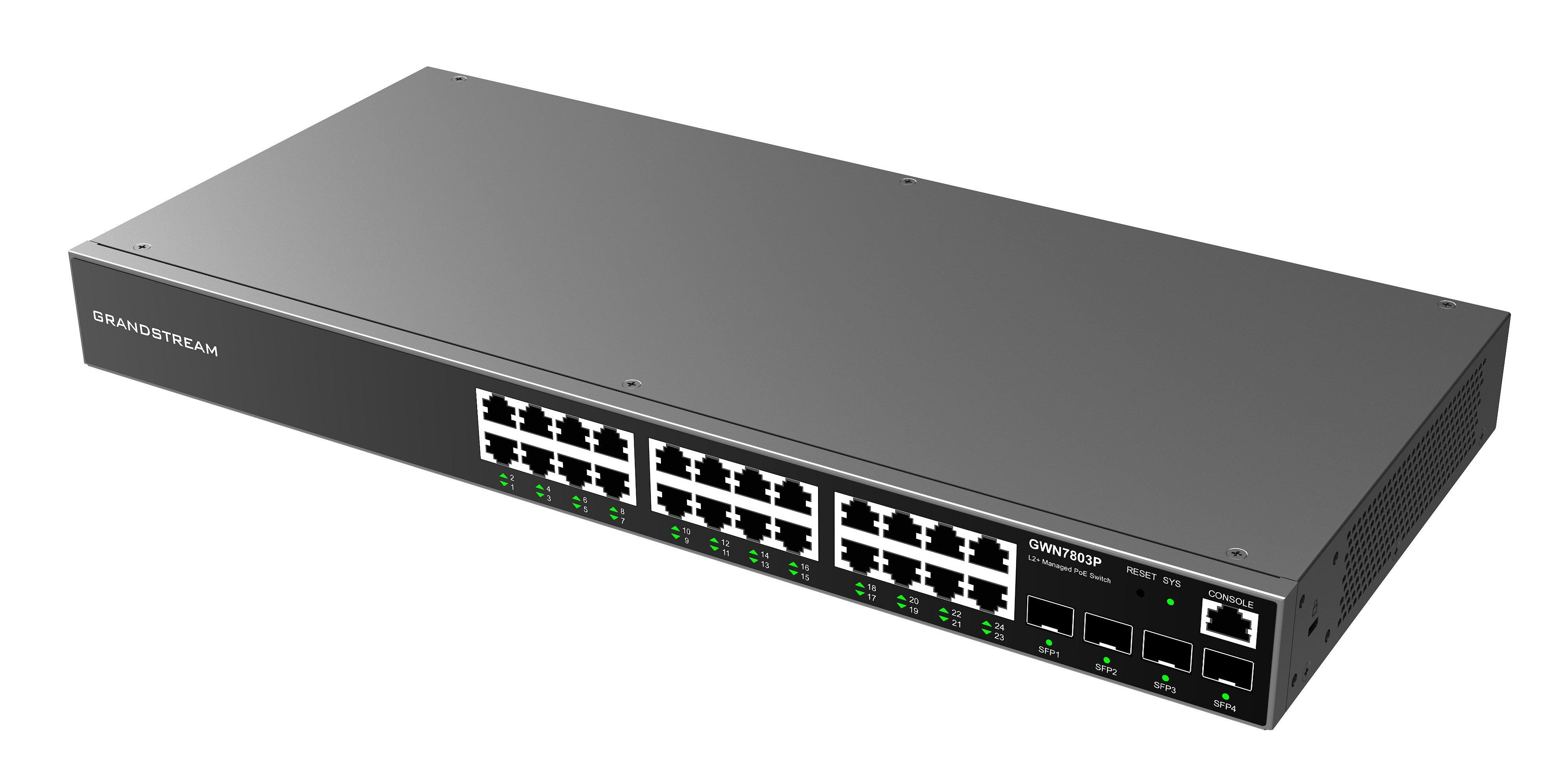 Integrovaný řadič pro správu přepínače; GDMS Networking a GWN Manager, cloudová a lokální platforma Grandstream pro správu Wi-Fi, a směrovače řady GWN
