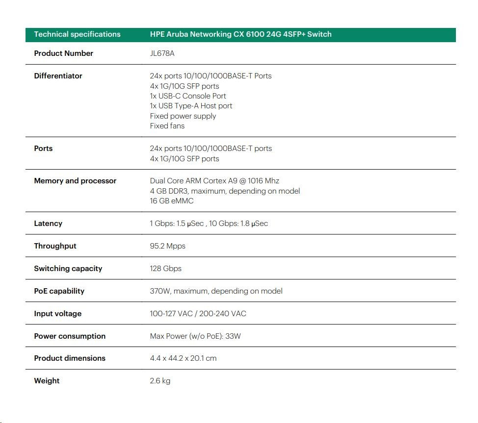 | Ports | 24x 10/100/1000BASE-T, 4x 1G/10G SFP | |