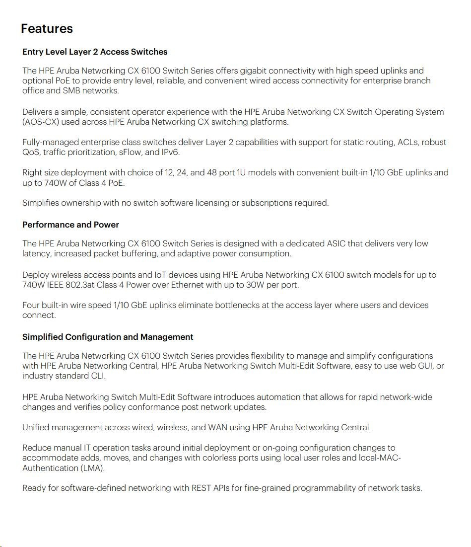 Supports Power over Ethernet (PoE) up to 370W (24-port) or 740W (48-port) models