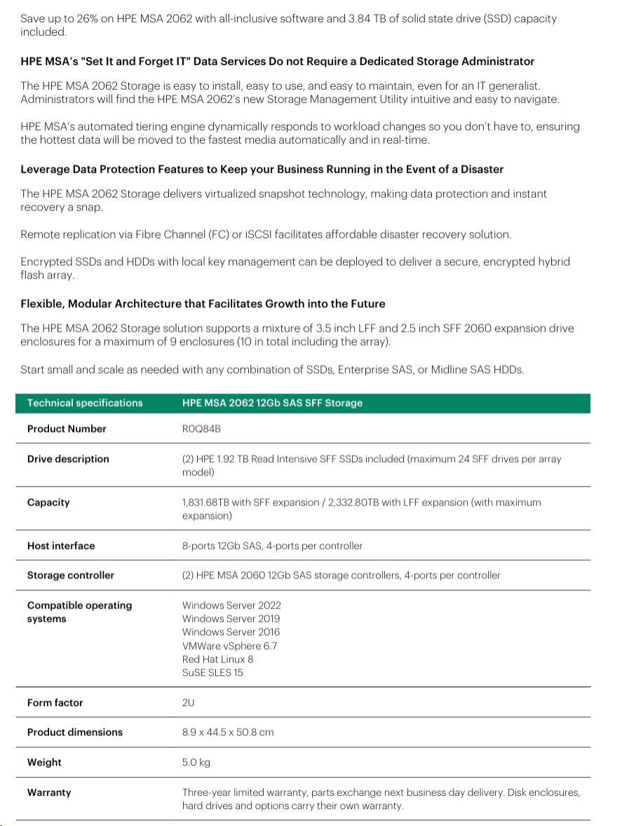 HPE MSA 2062 10GbE iSCSI SFF storage (+ 2x1.92TB SSD + One Advanced Data Services LTU )