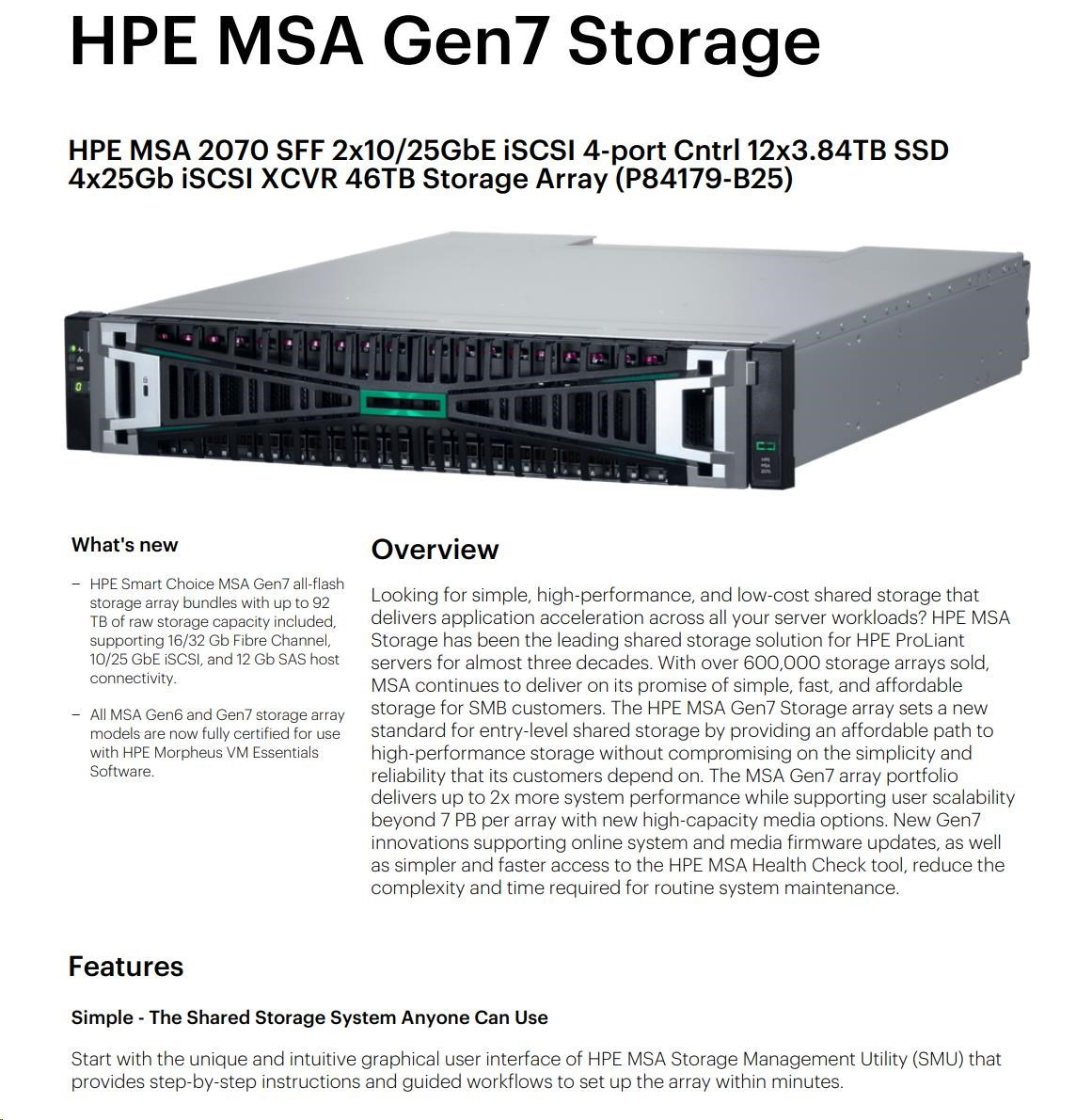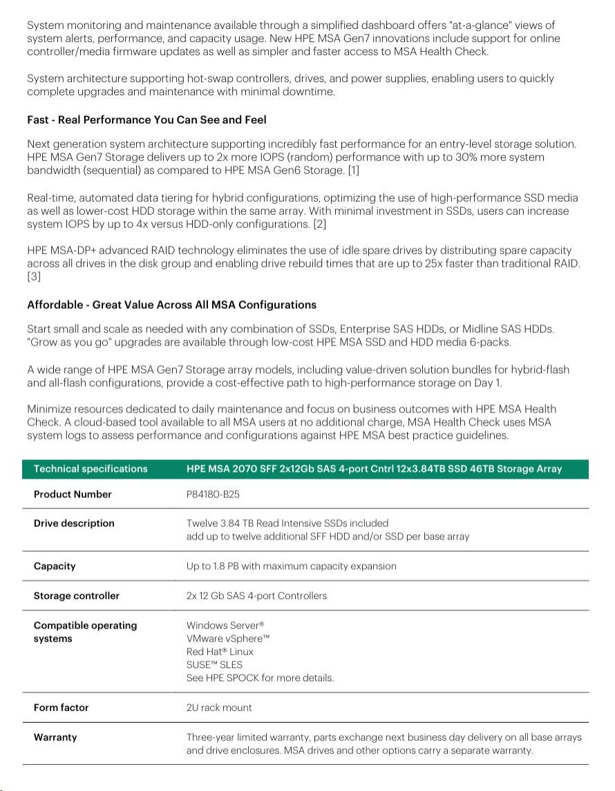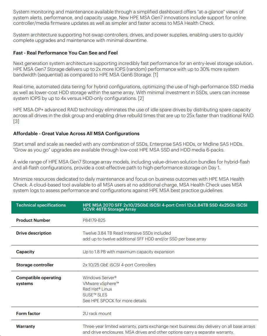 HPE MSA 2070 SFF 2x10/25GbE iSCSI 4-port Controller 12x3.84TB SSD 4x25Gb iSCSI XCVR 46TB Storage Array Smart Choice