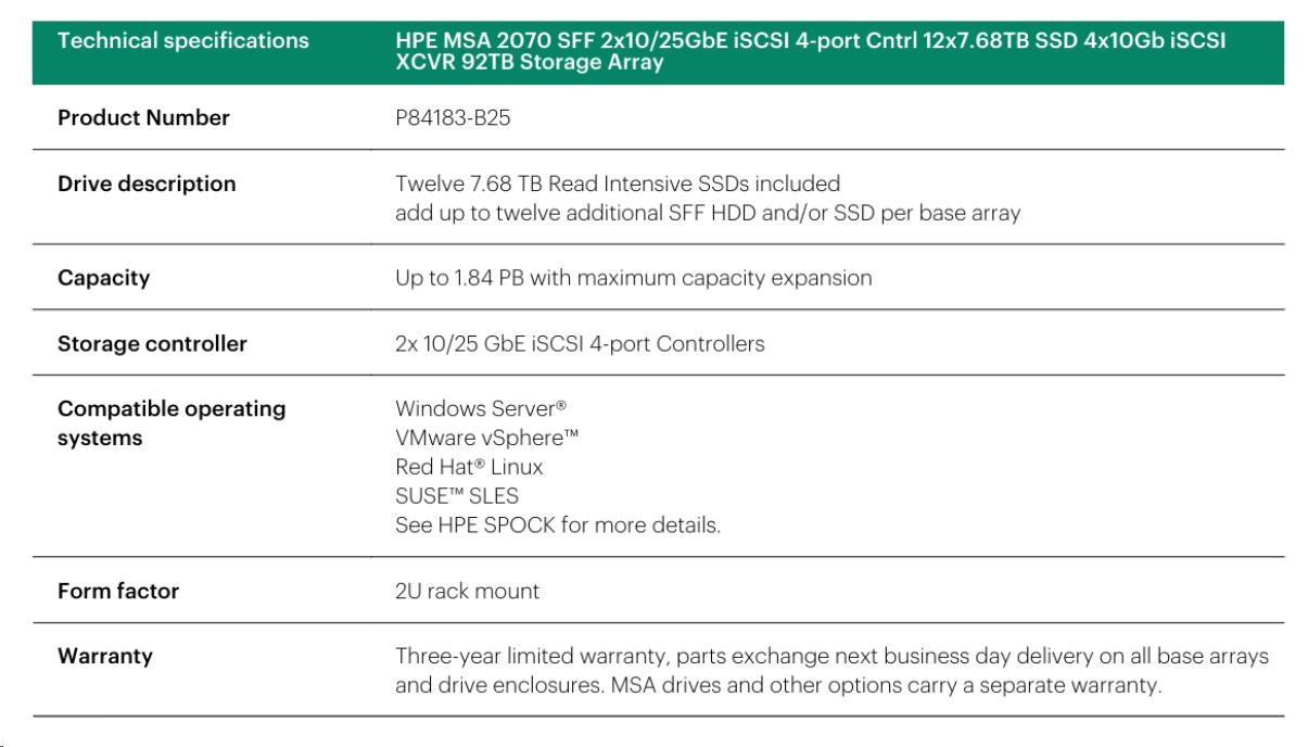 HPE MSA 2070 SFF 2x10/25GbE iSCSI 4-port Controller 12x7.68TB SSD 4x10Gb iSCSI XCVR 92TB Storage Array Smart Choice.