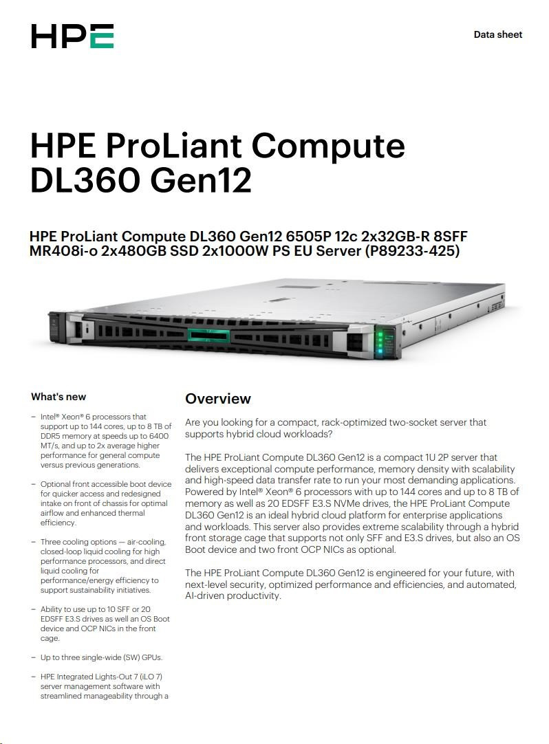 HPE PL DL360 Gen12 6505P (2.2/12C) 2x32G (P69727) 2x480G MR408i-o 8SFF 2x1000W 10GbE NBD333 Smart ChoicePE ProLiant Compute DL320 Gen12 Datasheet