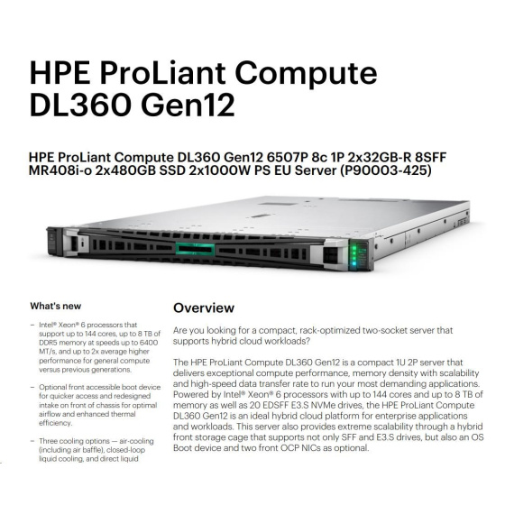 | Model Name | HPE ProLiant Compute DL360 Gen12 6507P 8c 1P 2x32GB-R 8SFF MR408i-o 2x480GB SSD 2x1000W PS EU Server |