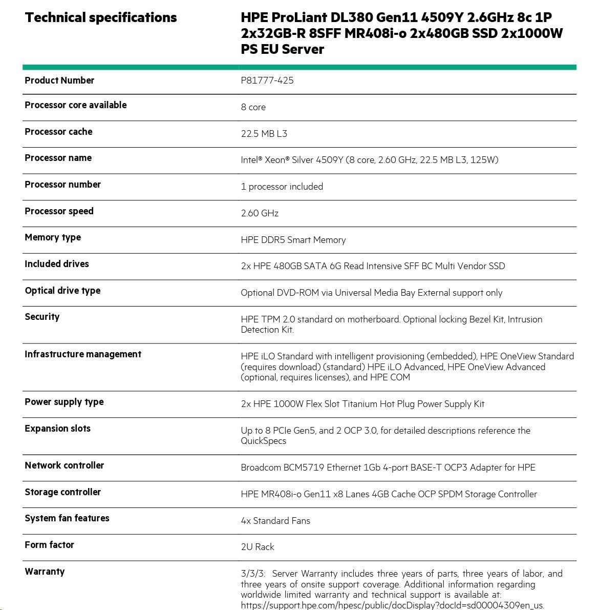 Provedení serveru:Rack, 2U Rack; Výrobce CPU:Intel; Maximální počet procesorů:2; Řada procesorů:Intel 8 Core Xeon; Model procesoru:Intel Xeon 4509Y; Velikost paměti RAM (GB):64; Maximální paměťová kapacita serveru (GB):6144; Maximální počet slotů PCIe:3; Maximální počet HDD v serveru:8; Hot-plug cage pro HDD:2.5" SFF; RAID:1, 5, 10, 60.Více