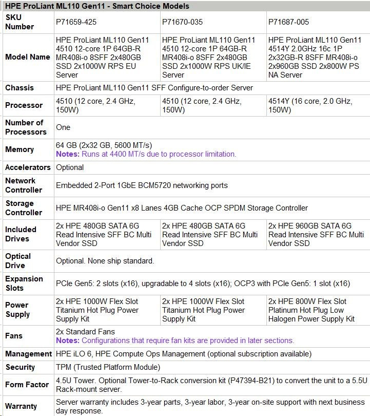 Model Name | HPE ProLiant ML110 Gen11 4510 12-core 1P 64GB-R MR408i-o 8SFF 2x480GB SSD 2x1000W RPS EU Server |
