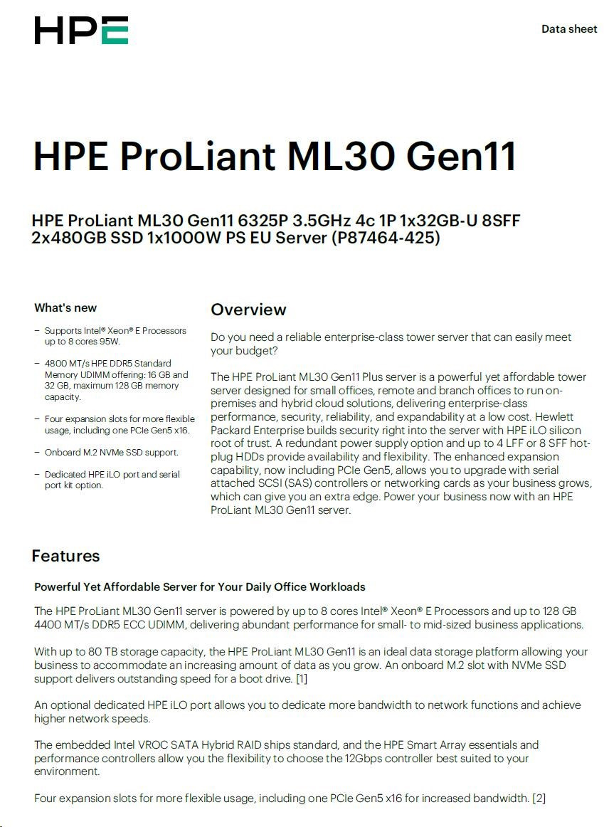 Provedení serveru:Tower; Výrobce CPU:Intel; Maximální počet procesorů:1; Řada procesorů:Intel 4 Core Xeon; SSD Kapacita (GB):960; Model procesoru:Intel Xeon E-2434; Velikost paměti RAM (GB):32; Maximální paměťová kapacita serveru (GB):128; Maximální počet slotů PCIe:4; Maximální počet HDD v serveru:8; Hot-plug cage pro HDD:2.5" SFF; RAID:1, 5, 10.Více