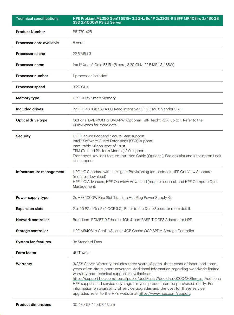 Provedení serveru:Tower; Výrobce CPU:Intel; Maximální počet procesorů:2; Řada procesorů:Intel 8 Core Xeon; SSD Kapacita (GB):480; Model procesoru:Intel Xeon 5515+; Velikost paměti RAM (GB):64; Maximální paměťová kapacita serveru (GB):3072; Maximální počet slotů PCIe:6 a více; Maximální počet HDD v serveru:24; Hot-plug cage pro HDD:2.5" SFF; RAID:1, 5, 10.Více