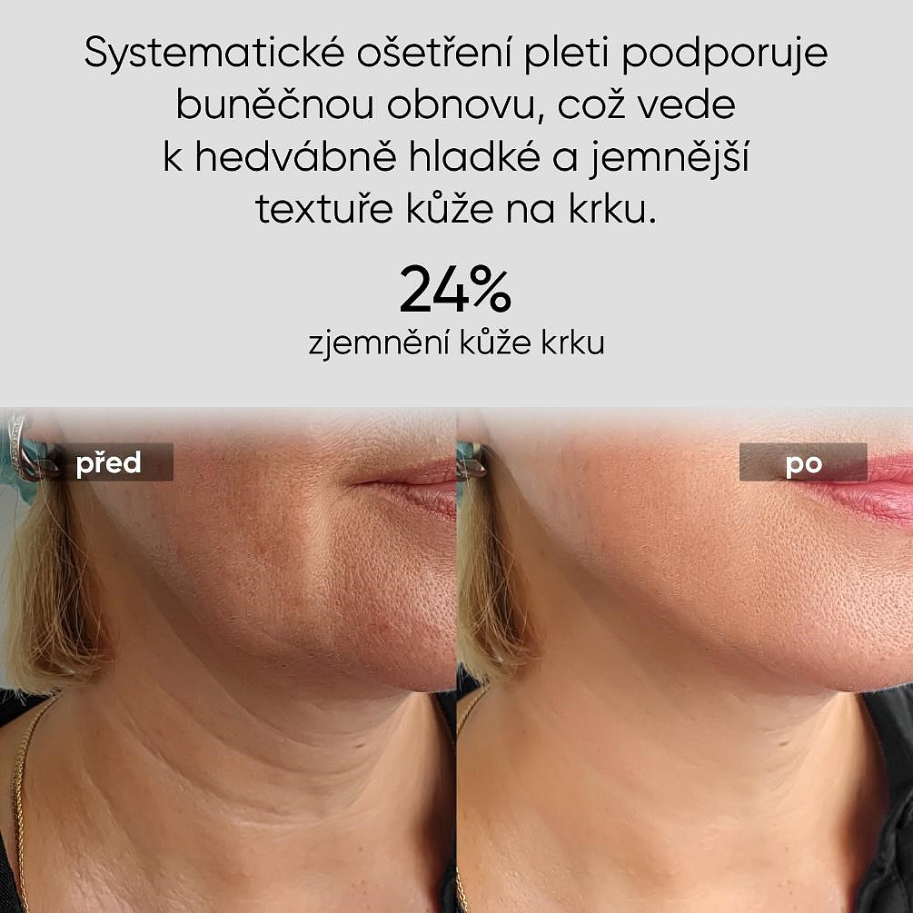 Tato unikátní maska byla navržena tak, aby dokonale pokryla nejen krk, ale i celý hrudník a horní část zad. Klíčový rozdíl oproti běžným maskám spočívá v cíleném, konturovaném designu, díky kterému těsně obepíná a ošetřuje oblast krku, dekoltu a horní části zad. Využívá klinicky ověřenou sílu vysoce čistého červeného světla o vlnové délce 660nm, které je standardem v profesionální dermatologické péči. Světlo proniká hluboko do pokožky, kde stimuluje produkci kolagenu, zrychluje regeneraci buněk a pomáhá napravovat poškození způsobené UV zářením. Výsledkem je viditelně pevnější, hladší a barevně sjednocená pokožka.