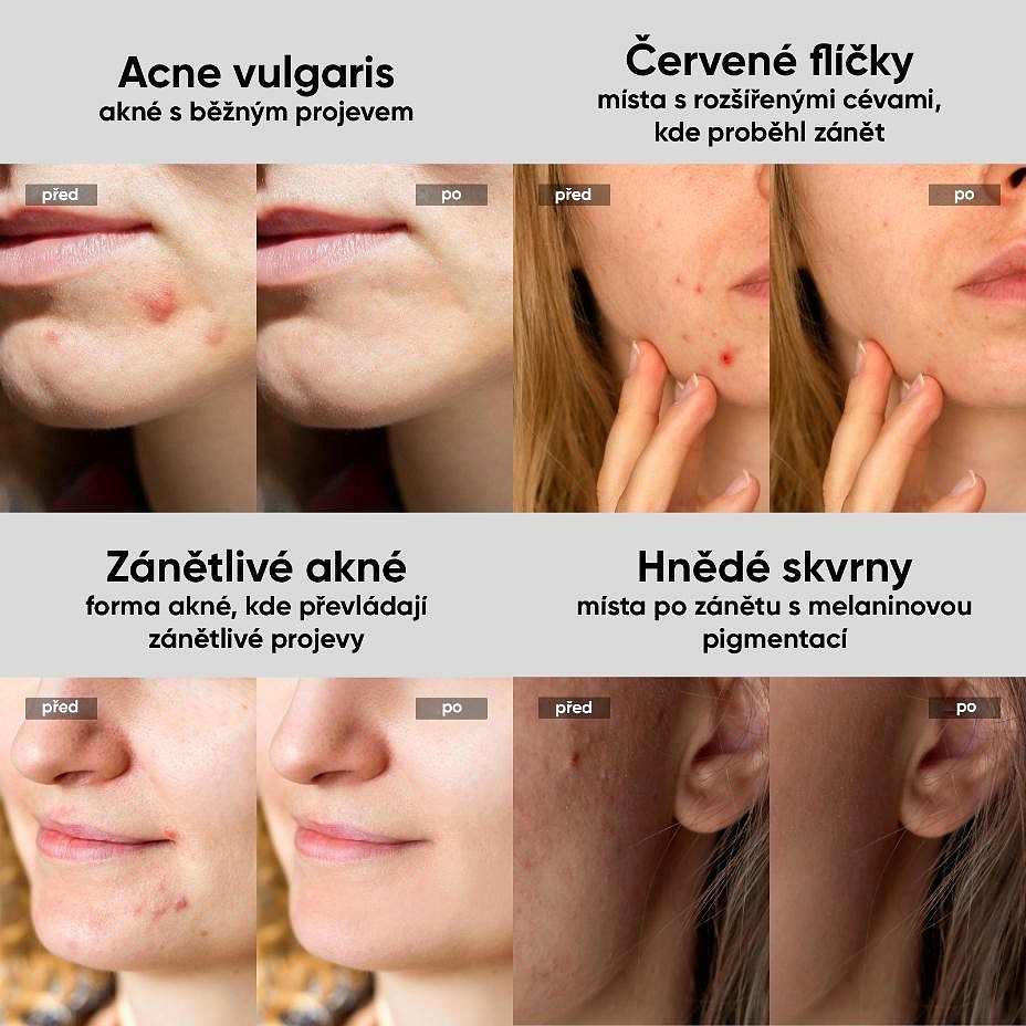 - Pásmo 800-1200nm: Proniká hlouběji do pokožky, kde působí na mazové žlázy. Inhibuje jejich nadměrnou aktivitu, vyrovnává produkci mazu a zabraňuje ucpávání pórů. Zároveň stimuluje regeneraci kolagenu, což urychluje hojení a zesvětlování stop po akné.