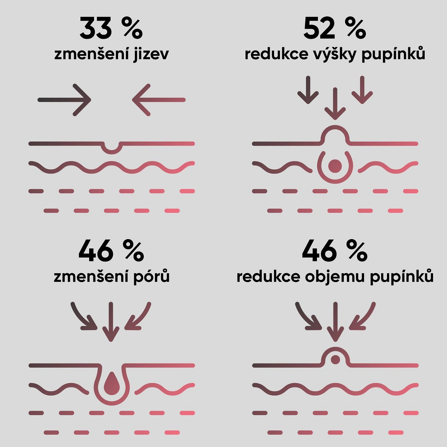 - Klinicky ověřená účinnost: Likviduje více než 99 % bakterií Propionibacterium acnes, redukuje kožní maz o 56 % za 3 dny a zmenšuje objem akné o 63 % za 7 dní.