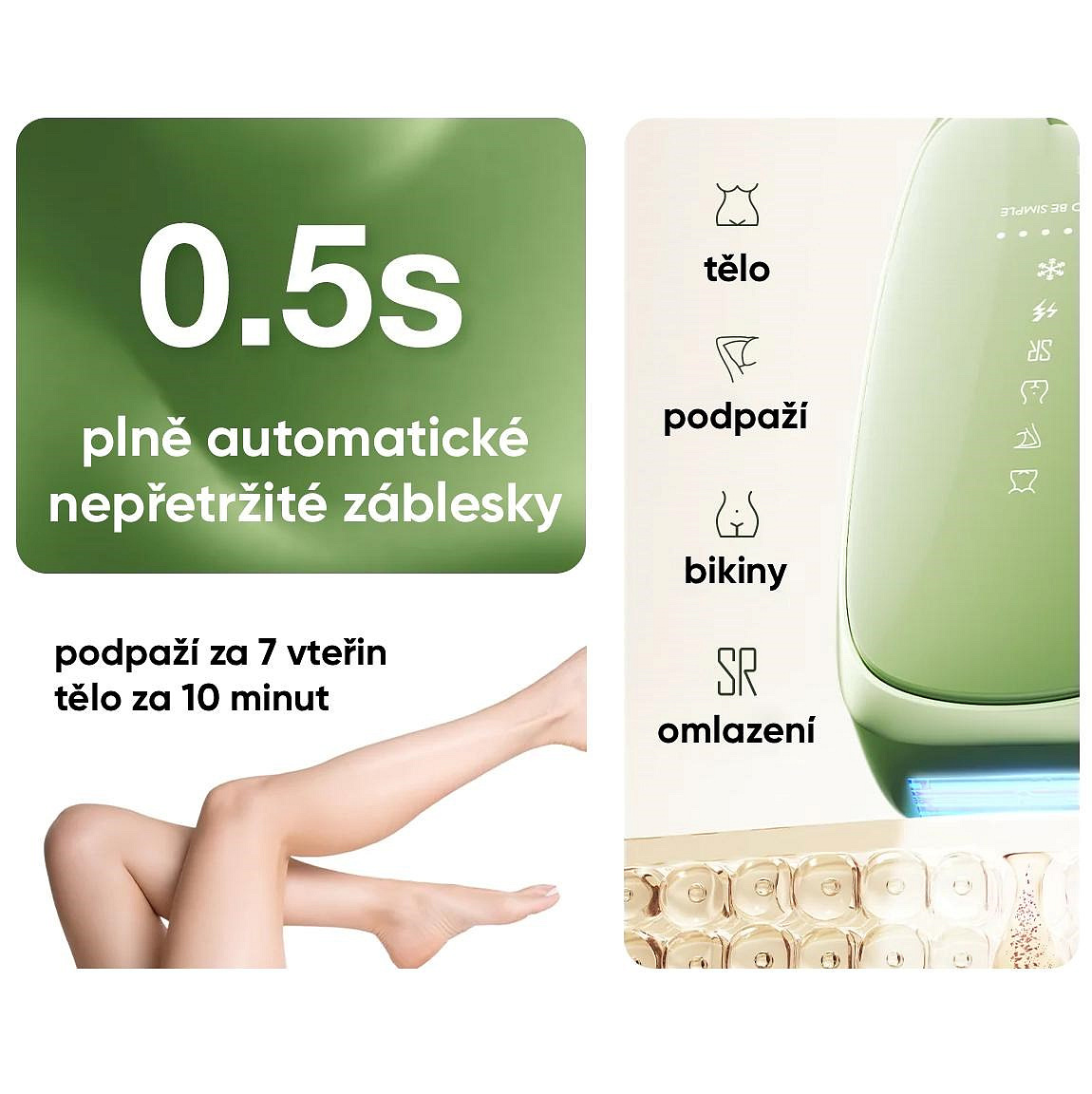JOVS Scroll mění pravidla hry díky své impozantní energii 21 Joulů a extrémně rychlým zábleskům v intervalu pouhých 0,2 sekundy. Tato kombinace síly a rychlosti znamená, že ošetření celého těla je otázkou několika minut, nikoli hodin. Přístroj navíc nabízí víc než jen odstranění chloupků; jeho druhý režim je zaměřen na vyhlazení a omlazení pokožky, čímž získáte komplexní péči v jediném kroku.