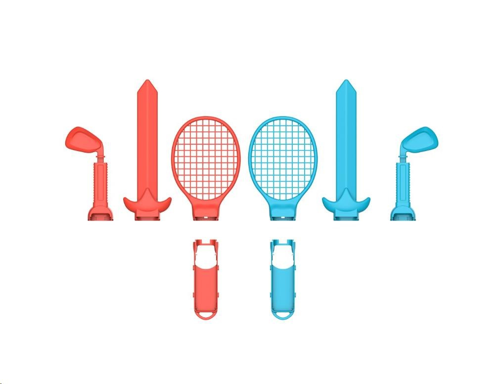 Obsah balení: 2 závodní volanty, 2 tenisové/badmintonové rakety, 2x 2v1 popruhy, 2 meče, 2 golfové hole, 2 pistole, 2x rukojetí Joy-Con, 2x adaptéry.