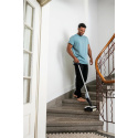Podlahová myčka FC 2-4 je skvělým pomocníkem při úklidu díky své samonosné konstrukci a lehké váze pouhých 2,2 kg. Díky automatickému zapínání a vypínání je ovládání velmi intuitivní – stačí jednoduše zatáhnout za rukojeť čističe směrem dozadu a myčka se sama spustí. V jediném kroku pak snadno odstraní suché i mokré každodenní nečistoty. Baterie vystačí až 20 minut čištění, což je dostačující pro úklid plochy o rozloze cca 70 m2. Válec myčky se po aktivaci automaticky navlhčí vodou z nádrže na čerstvou vodu, což zajišťuje rovnoměrné a efektivní čištění tvrdých podlah vždy čistou vodou. Myčka umožňuje čištění až po okraj a díky integrovaným vlasovým filtrům lze snadno sbírat i vlasy a další nečistoty. Integrovaná hygienická nádrž na špinavou vodu zamezuje kontaktu s nečistotami a po použití ji lze snadno vyjmout a vyčistit. Přiložená výměnná baterie 4V od Kärcher Battery Power je kompatibilní se všemi 4V zařízeními této značky.