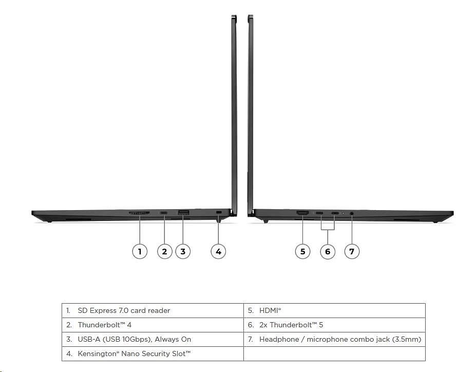 HDMI, 3.5mm Jack, Thunderbolt, USB 3.2 Gen 2, SD karta