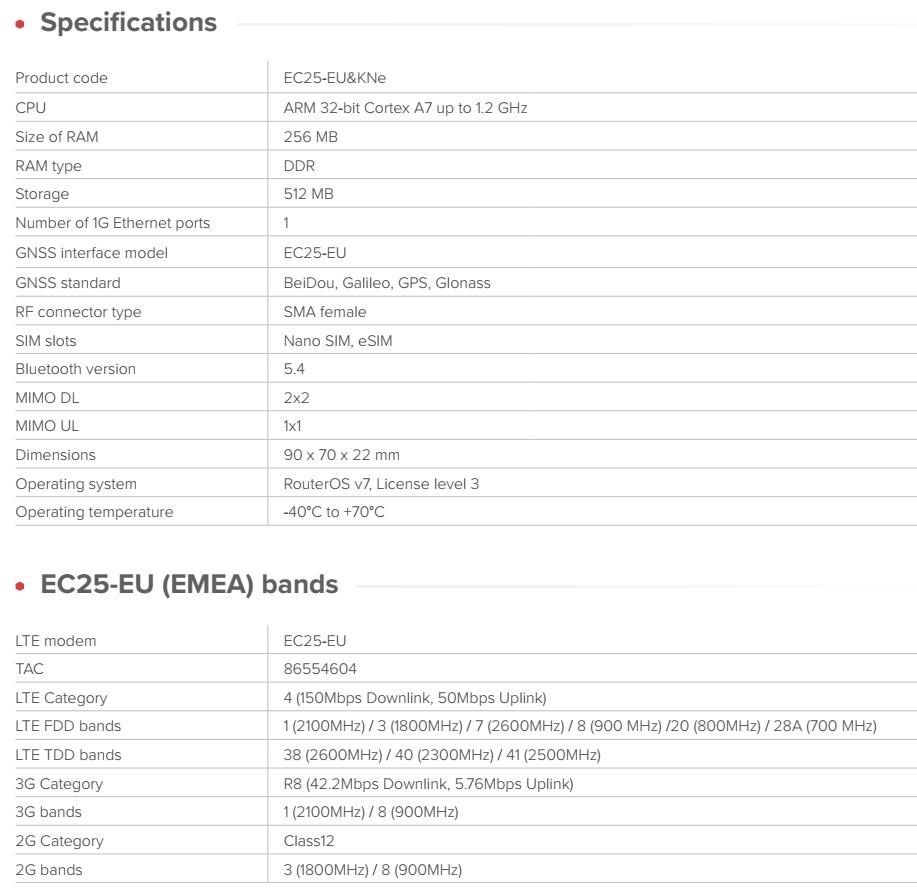 Brána IoT průmyslové třídy s LTE/BLE/GNSS konektivitou pro inteligentní sledování majetku, vzdálené monitorování a efektivní automatizaci. Původně navrženo pro kávovary a prodejní automaty – ideální pro všechny druhy průmyslové automatizace. KNOT Embedded LTE4 je malá, ale výkonná průmyslová LTE brána určená pro integrátory, specialisty na automatizaci a tvůrce systémů IoT. Hodí se do stísněných prostor, montuje se přímo na DIN lištu a poskytuje spolehlivé připojení LTE Cat4 s podporou Bluetooth a GNSS. Použijte ji jako primární bránu, záložní spojení nebo uzel pro sběr dat IoT – vše je poháněno systémem RouterOS pro maximální flexibilitu. Funkce a vlastnosti KNOT Embedded LTE4 je určen pro prostředí, kde je omezený prostor, ale spolehlivost je zásadní: • Infrastruktura inteligentních měst (parkování, senzory, měření) • Monitorování kávovarů a prodejních automatů • Skříně pro průmyslovou automatizaci • Monitorování životního prostředí a veřejných služeb • Sledování vozidel nebo majetku pomocí GNSS • Prodejní kiosky, platební terminály, digitální značení • Záložní připojení LTE pro stávající zařízení Ethernet • Brány IoT pro senzory a majáky BLE Upozornění: IoT brána není plnohodnotným LTE routerem. SIM karta není určená pro vytáčení připojení, ale pro komunikaci v síti IoT. IoT brána nedisponuje LTE modemem. Technické specifikace: Product code: EC25-EU&KNe CPU: ARM 32-bit Cortex A7 up to 1.2 GHz Size of RAM: 256 MB RAM type: DDR Storage: 512 MB Number of 1G Ethernet ports: 1 GNSS interface model: EC25-EU GNSS standard: BeiDou, Galileo, GPS, Glonass RF connector type: SMA female SIM slots: Nano SIM, eSIM Bluetooth version: 5.4 MIMO DL: 2x2 MIMO UL: 1x1 Dimensions: 90 x 70 x 22 mm Operating system: RouterOS v7, License level 3 Operating temperature: -40°C to +70°C Napájení: Number of DC inputs: 2 (PoE-In, USB Type-C (powering only)) PoE-In input Voltage: 12-57 V USB Type-C input voltage: 5 V Power adapter nominal voltage: 5 V Power adapter nominal current: 0.8 A PoE-in: 802.3af/at Max power consumption: 7 W EC25-EU (EMEA) podporovaná pásma: LTE modem: EC25-EU TAC: 86554604 LTE Category: 4 (150Mbps Downlink, 50Mbps Uplink) LTE FDD bands: 1 (2100MHz) / 3 (1800MHz) / 7 (2600MHz) / 8 (900 MHz) /20 (800MHz) / 28A (700 MHz) LTE TDD bands: 38 (2600MHz) / 40 (2300MHz) / 41 (2500MHz) 3G Category: R8 (42.2Mbps Downlink, 5.76Mbps Uplink) 3G bands: 1 (2100MHz) / 8 (900MHz) 2G Category: Class12 2G bands: 3 (1800MHz) / 8 (900MHz) Internet věcí (anglicky Internet of Things, zkratka IoT) je termínem pro moderní přístroje ovladatelné i na dálku pomocí internetu. Snadno je tak obsloužíte pomocí svého chytrého telefonu nebo je jednoduše připojíte k centrální jednotce. Umožní tak snadno zautomatizovat věci, o které byste se jinak museli postarat sami. Jedná se o technologický koncept umožňující realizaci takzvaného "inteligentního domu" (automatické zhasínání světel, ovládání vytápění apod.). Umožňuje řídit klimatizaci, vyhřívání vašeho bazénu, ohřev vody, pečovat o vaše akvárium, obsluhovat nastavení alarmu či mechanických zámků. Pokud si nejste jistí, zda jste v ranním shonu vypnuli žehličku, můžete na dálku odpojit od sítě jednotlivé zásuvky. Vaše lednička vás dokáže upozornit na chybějící potraviny a připravovat aktualizovaný nákupní seznam. Upozornění Výrobce Mikrotik neposkytuje záruku na zařízení poškozená přepětím. Zařízení je třeba adekvátně chránit proti indukovanému elektrostatickému přepětí či přepěťovým špičkám na silovém vedení. Pro venkovní instalace používat výhradně stíněnou kabeláž (FTP/SFTP), jednotky korektně uzemnit (užití integrovaného zemnícího členu, ethernetové přepěťové ochrany). Zařízení vždy provozujte s poslední výrobcem publikovanou verzí (výrobcem označenou "Stable") operačního systému RouterOS. Taková verze garantuje nejoptimálnější funčknost, obsahuje opravené chyby z verzí předchozích a výkonová i funční vylepšení.Taková verze garantuje nejoptimálnější funčknost, obsahuje opravené chyby z verzí předchozích a výkonová vylepšení. . , ,