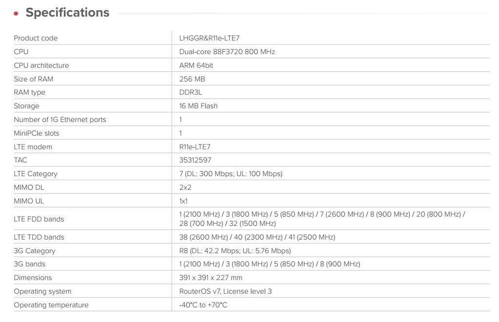 Extra výkonný venkovní aktivní prvek pro připojení k LTE na dlouhé vzdálenosti či odloučených lokalitách se slabým pokrytím signálem. LHGG LTE7 kit je navržena pro spolehlivý přístup k internetu „na poslední míli“ ve vzdálených lokalitách. Namontujte ji venku na sloup nebo stožár a připojte se i tam, kde mobilní telefony selhávají. Je vybavena směrovou anténou s vysokým ziskem 17dBi a modemem CAT7 LTE s rychlostí nahrávání až 100 Mbps, což zajišťuje vyšší výkon a lepší odezvu ve venkovských oblastech. Díky dvojnásobné kapacitě uplinku je vhodnější pro video dohled, VPN, práci na dálku a nasazení ve venkovských oblastech s více uživateli. Lehká mřížková konstrukce antény snižuje zatížení větrem a zároveň zachovává vysoký zisk. Lze ji montovat různými způsoby, včetně stožárů a sloupů. Odolný kryt a provozní teplotní rozsah od -40 °C do +70 °C zajišťují spolehlivý výkon v náročných klimatických podmínkách. Robustní chladič udržuje systém stabilní i při nepřetržitém zatížení. Hlavní funkce a vlastnosti: • VYSOKORYCHLOSTNÍ INTERNET I V ODLEHLÝCH LOKALITÁCH • RYCHLÝ MODEM CAT6 LTE • MODERNÍ DVOUJÁDROVÝ PROCESOR ARM • GIGABITOVÝ ETHERNET SE VSTUPEM POE-IN • PODPORA PÁSMA B28 • VELKÁ ANTÉNA S VYSOKÝM ZISKEM • MŘÍŽKOVÁ KONSTRUKCE ANTÉNY PRO NEJEXTRÉMNĚJŠÍ METEO PODMÍNKY RouterOS Mikrotik plně podporuje sítě IPv6 Technické specifikace: Product code: LHGGR&R11e-LTE7 CPU: Dual-core 88F3720 800 MHz CPU architecture: ARM 64bit Size of RAM 256 MB RAM type: DDR3L Storage: 16 MB Flash Number of 1G Ethernet ports: 1 MiniPCIe slots: 1 LTE modem: R11e-LTE7 TAC: 35312597 LTE Category: 7 (DL: 300 Mbps; UL: 100 Mbps) MIMO DL: 2x2 MIMO UL: 1x1 LTE FDD bands: 1 (2100 MHz) / 3 (1800 MHz) / 5 (850 MHz) / 7 (2600 MHz) / 8 (900 MHz) / 20 (800 MHz) / 28 (700 MHz) / 32 (1500 MHz) LTE TDD bands: 38 (2600 MHz) / 40 (2300 MHz) / 41 (2500 MHz) 3G Category: R8 (DL: 42.2 Mbps; UL: 5.76 Mbps) 3G bands: 1 (2100 MHz) / 3 (1800 MHz) / 5 (850 MHz) / 8 (900 MHz) Dimensions: 391 x 391 x 227 mm Operating system: RouterOS v7, License level 3 Operating temperature: -40°C to +70°C Napájení: DC input: PoE-In PoE-In input Voltage: 12-57 V Power adapter nominal voltage: 24 V Power adapter nominal current: 0.8 A PoE-in: 802.3af/at Max power consumption: 8 W. , ,