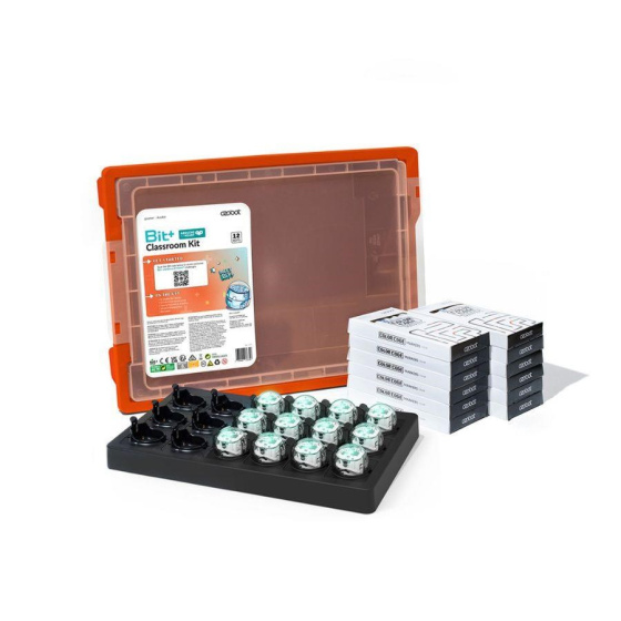 12 robotů Ozobot Bit+ 12 sad oboustranných barevných fixů Nabíjecí stanice s 12 sloty Samolepky a příslušenství k botům Návod k použití Dokumentace