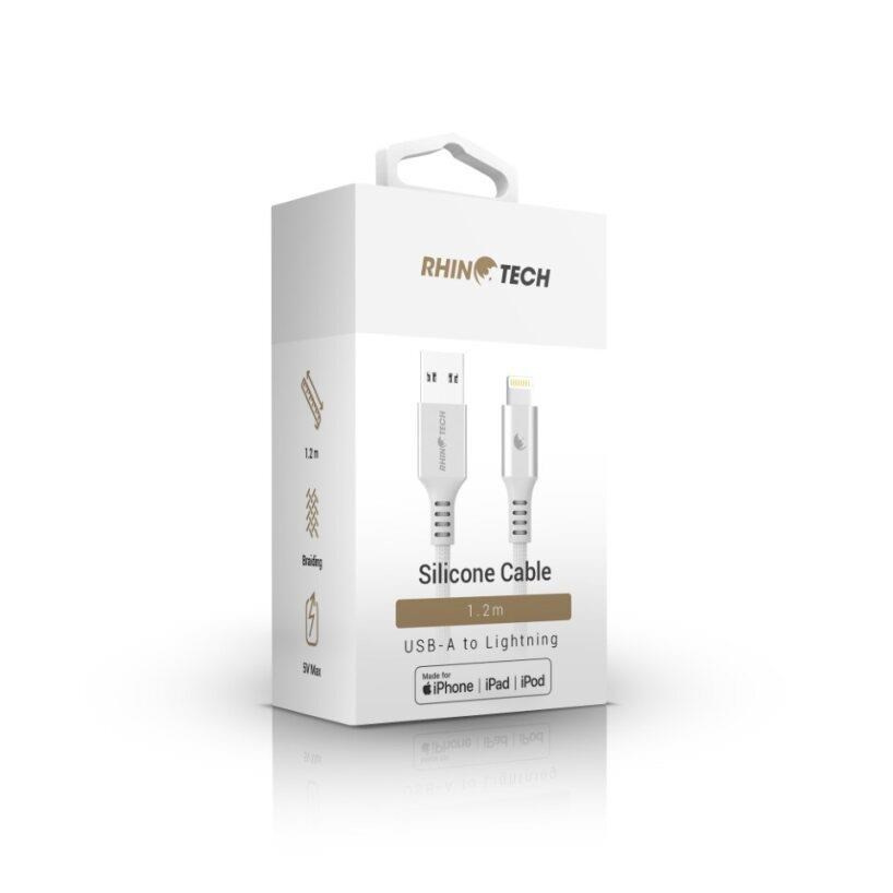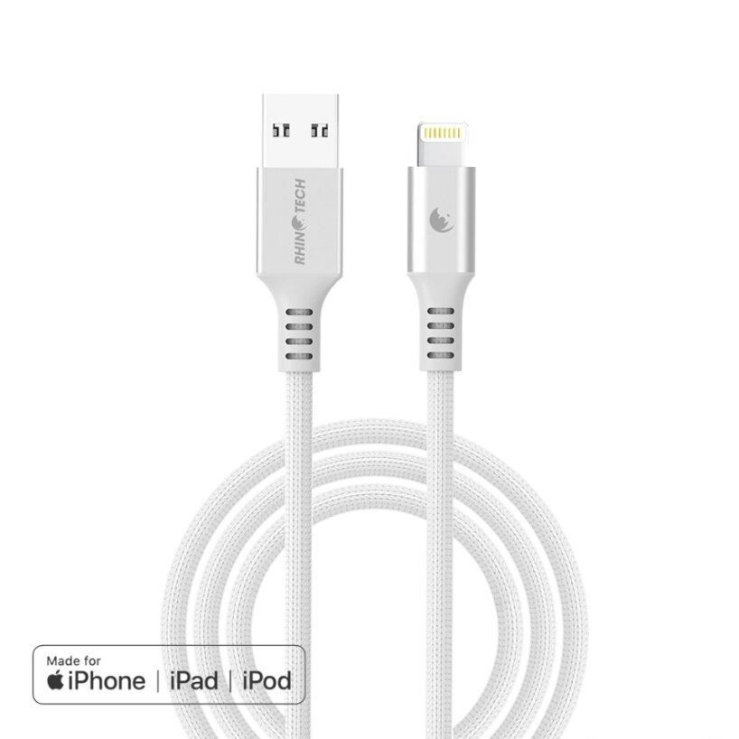 Kvalitní RhinoTech datový a nabíjecí MFi kabel z odolného nylonového materiálu s konektory USB-A na Lightning o délce 1,2m v elegantní stříbrné barvě.