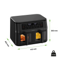 Když zrovna tuto kompaktní fritézu nepoužíváte, můžete ji bez potíží uložit do takřka jakékoliv skříňky kuchyňské linky. Její rozměry jsou totiž i přes dvojitou kapacitu pouhých 412 × 402 × 300 mm (při hmotnosti 8,5 kg).