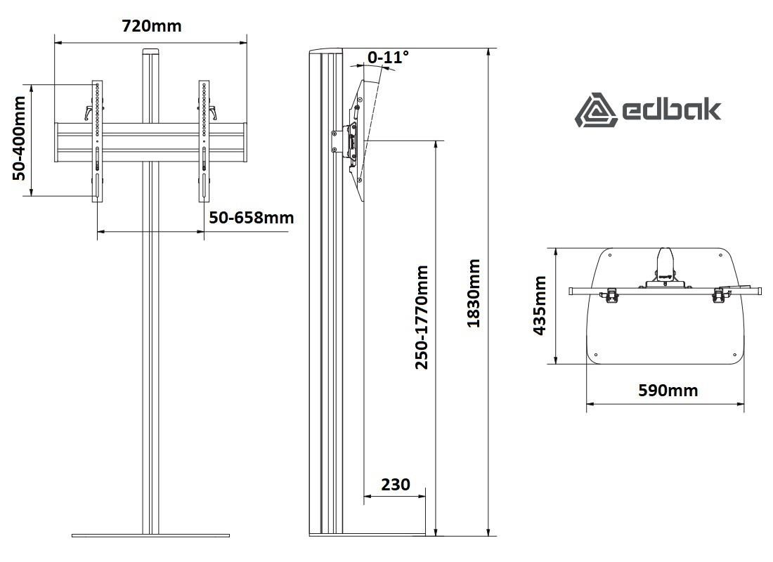 Profesionální Tv stojan Edbak STDV100 Stojan na Tv a monitory 40-75", nastavitelná výška obrazovky 250-1770mm, náklon 0°/-11°, vedení kabeláže, VESA 75x75 až 600x400, nosnost 80kg, Profesionální designový stojan pro zavěšení televizorů, monitorů a dotykových obrazovek s úhlopříčkou 40" až 75". Stojan je vyroben z hliníku, podstava je z litiny o rozměrech 590x435x10mm. Podstavu je nutné ukotvit do podlahy nebo připraveného podstavce - není samostojný. Obrazovky je na stojanu možné nastavit do potřebné výšky od 250mm až do 1770mm (vzdálenost od podlahy po střed obrazovky) a nastavit náklon od 0° až do -11°. Stojan je možné zakoupit včetně poličky na příslušenství a poličky na kameru. Stojan podporuje VESA standardy 75x75 až 600x400 a má nosnost 80kg. Materiál hliník a litina. Poličky jsou kovové. Instalační materiál. Záruka 5 let. Profesionální designový podlahový stojan na televize, monitory a dotykové obrazovky Edbak STDV100 Technické údaje: nosnost 80kg podporuje VESA standardy 75x75 až 600x400 na televize, monitory a dotykové obrazovky 40" až 75" celková výška stojanu 1830mm nastavitelná výška obrazovky 250-1770mm (od podlahy po střed obrazovky) nastavitelný náklon obrazovky 0° až -11° podstava s otvory pro ukotvení do podlahy rozměry podstavy 590x435x10mm možnost zakoupení i s poličkou na příslušenství 400x300mm, nosnost 10kg možnost zakoupení i s poličkou na kameru 250x200mm, nosnost 10kg materiál hliník a litina profesionální výrobek nejvyšší kvality barevné provedení černé záruka 5 let Detaily Tv stojanu Edbak STDV100 Tv stojany Edbak STDV100 podporují VESA standardy: VESA 75x75 VESA 100x100 VESA 200x100 a 100x200 VESA 200x200 VESA 300x200 a 200x300 VESA 300x300 VESA 400x200 a 200x400 VESA 400x300 a 300x400 VESA 400x400 VESA 600x400 Stojan je možné zakoupit včetně poličky na příslušenství a poličky na kameru. Poličky jsou kovové a mají nosnost 10kg.. , ,